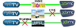 - SYMLINK=Disabled Moves the file to the new location and does not provide a symlink to MythTV. On top of this, it will purge MythTV's database of all information and pictures relating to the video content. MythTV will have no memory of the recording. This mode can be used if you wish to delete files from XBMC.