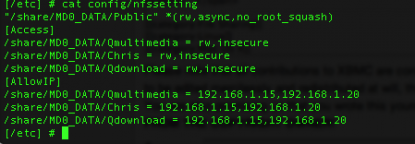 "/share/MD0_DATA/Qmultimedia" 192.168.1.15(insecure,rw,async,no_root_squash) 192.168.1.20(insecure,rw,async,no_root_squash) "/share/NFS/Qmultimedia" 192.168.1.15(insecure,rw,nohide,async,no_root_squash) 192.168.1.20(insecure,rw,nohide,async,no_root_squash)